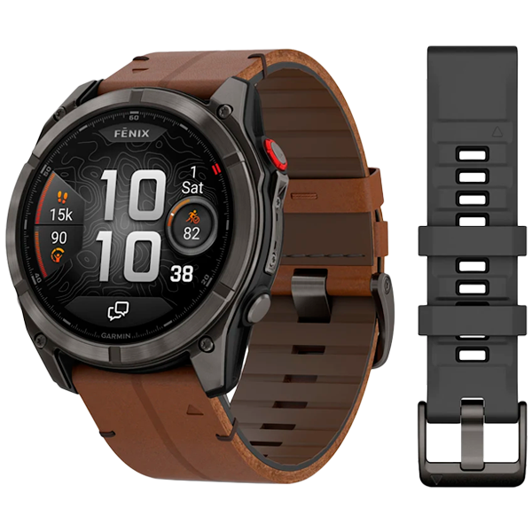 Garmin Fenix 8 Pro 51mm Amoled (010-03199-40) — премиальные мультиспортивные смарт-часы для серьезных спортсменов, альпинистов, любителей водных видов спорта и искателей приключений, которым необходимо оставаться на связи в экстремальных условиях. Модель оснащена ярким сенсорным AMOLED-дисплеем 1.4 дюйма с сапфировым стеклом, титановым безелем и корпусом из армированного полимера с покрытием Carbon Grey DLC. Защищенная конструкция корпуса обеспечивает водонепроницаемость 10 ATM, оснащена герметичными металлическими кнопками и защитой сенсоров от повреждений. Функционал включает предустановленные топографические карты TopoActive с рельефом, карты гольф-курортов и горнолыжных курортов, расширенные тренировочные метрики для мультиспорта, круглосуточный мониторинг здоровья с пульсометром, ЭКГ-приложением, Pulse Ox и анализом сна, встроенный LED-фонарик, автономность до 27 дней в режиме смарт-часов и 78 часов в GPS-режиме. Технология inReach обеспечивает спутниковую и LTE-связь для голосовых звонков, сообщений и экстренных SOS-сигналов. Комплектация: коричневый кожаный и черный силиконовый ремешки.