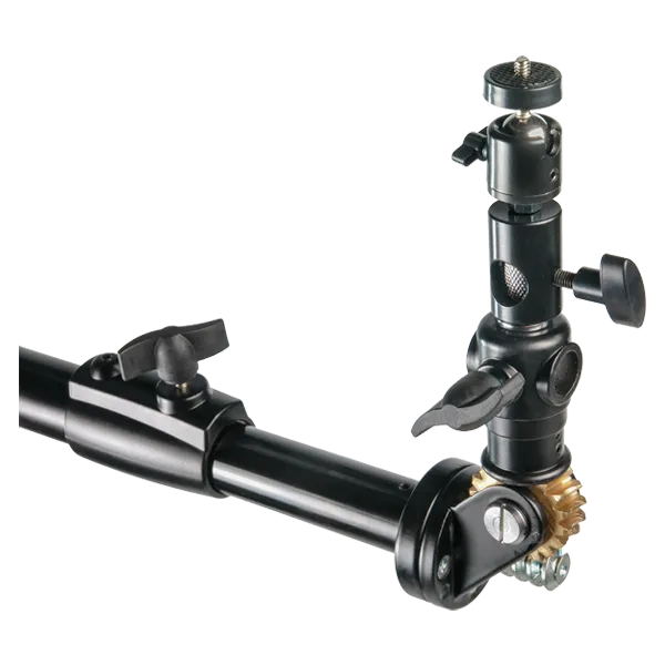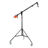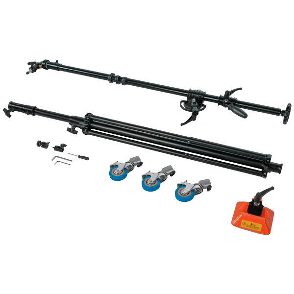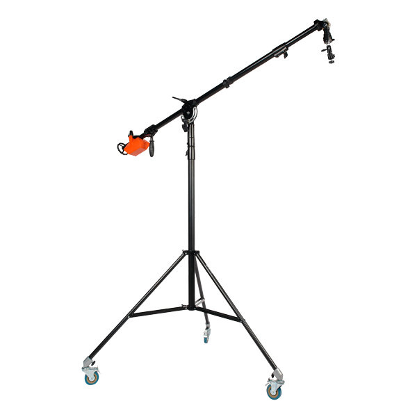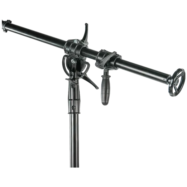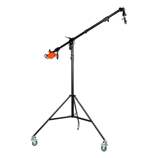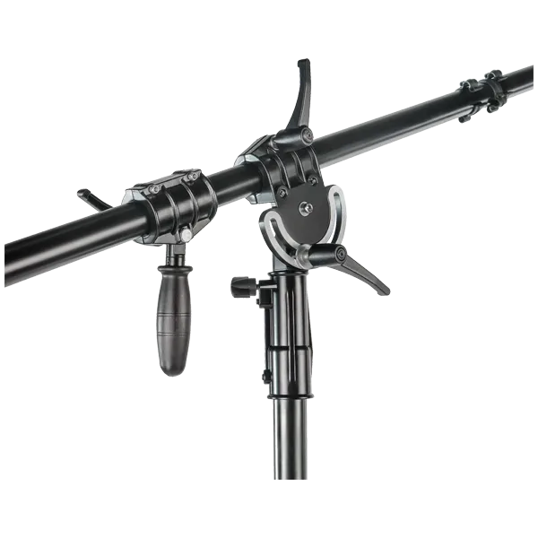 Falcon Eyes LSB-218MH — профессиональная стойка-журавль для студийной фото- и видеосъёмки, разработанная для точного позиционирования камер и осветительного оборудования. Она выполнена из высокопрочной стали и состоит из двухсекционной телескопической стойки и двухсекционной телескопической перекладины-журавля. Высота стойки регулируется в диапазоне от 110 до 218 см, а длина стрелы варьируется от 145 до 250 см, что даёт возможность разместить камеру или свет над объектом съёмки без попадания штатива в кадр. Максимальная нагрузка составляет 4-6 кг, при этом для устойчивости конструкции предусмотрен комплектный груз-противовес весом 6 кг. Телескопическая перекладина снабжена червячным механизмом, обеспечивающим плавный поворот шарнира на 170°, а на её конце установлен шпигот 5/8" с шаровой мини-головкой, позволяющий гибко менять направление света или положение камеры. Тренога с размахом ног 120 см и пружинная амортизация добавляют надёжности и безопасности при работе, а съёмные ролики диаметром 75 мм облегчают перемещение конструкции. В собранном состоянии общий вес журавля составляет около 17 кг.